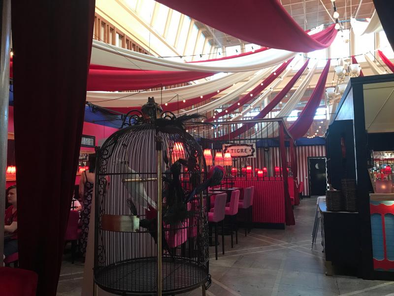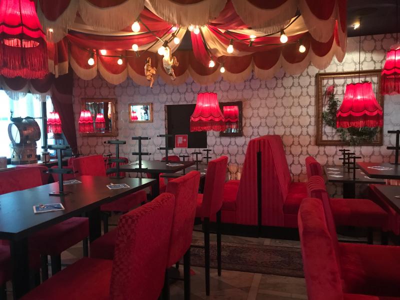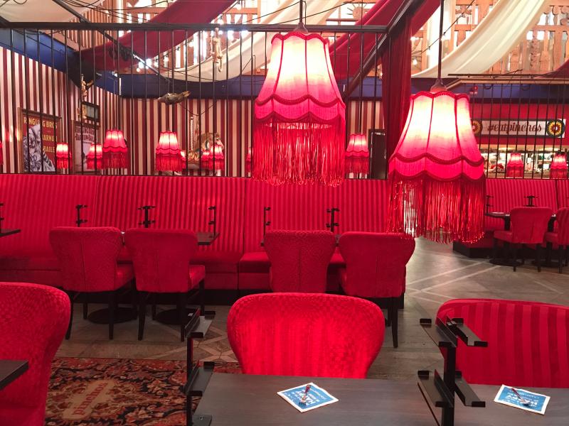Restaurangkedja med ett koncept där man läser menyn och beställer och betalar maten via en app. Inredningen och personalens klädsel har någon sorts cirkustema.