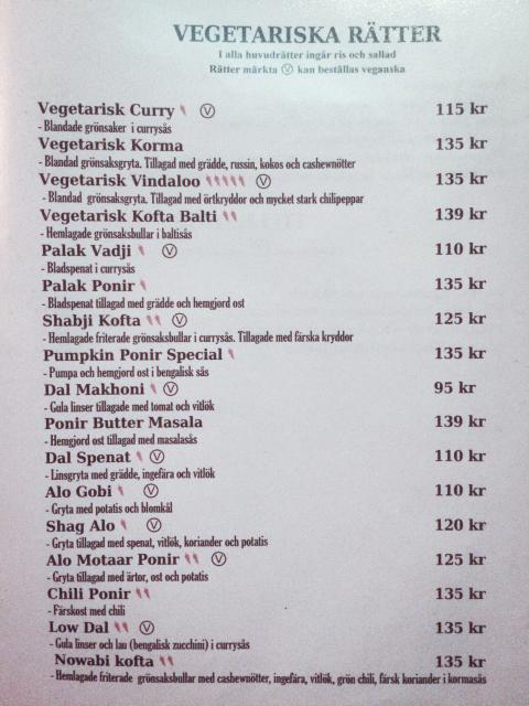 På kvällen går det att få följande rätter veganska: Vegetarisk Curry, Vegetarisk Vindaloo, Palak Vadji, Shabji Kofta, Dal Makhoni, Dal Spenat, Alo Gobi, Shag Alo, Law Dal, Chicken Tikka Masala.