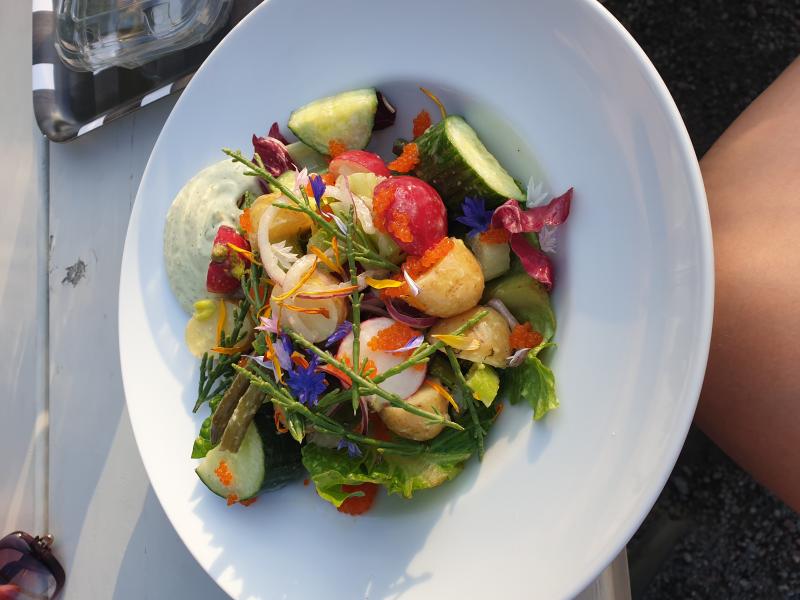Mysigt kafé som även serverar mat med fin uteservering mitt bland deras trädgård. Rätterna varierar från dag till dag men de har alltid veganska alternativ. Använder många egenodlade råvaror i menyn. Går också att handla hem grönsaker från deras odling vid skördesäsong. Stängt under vintern.